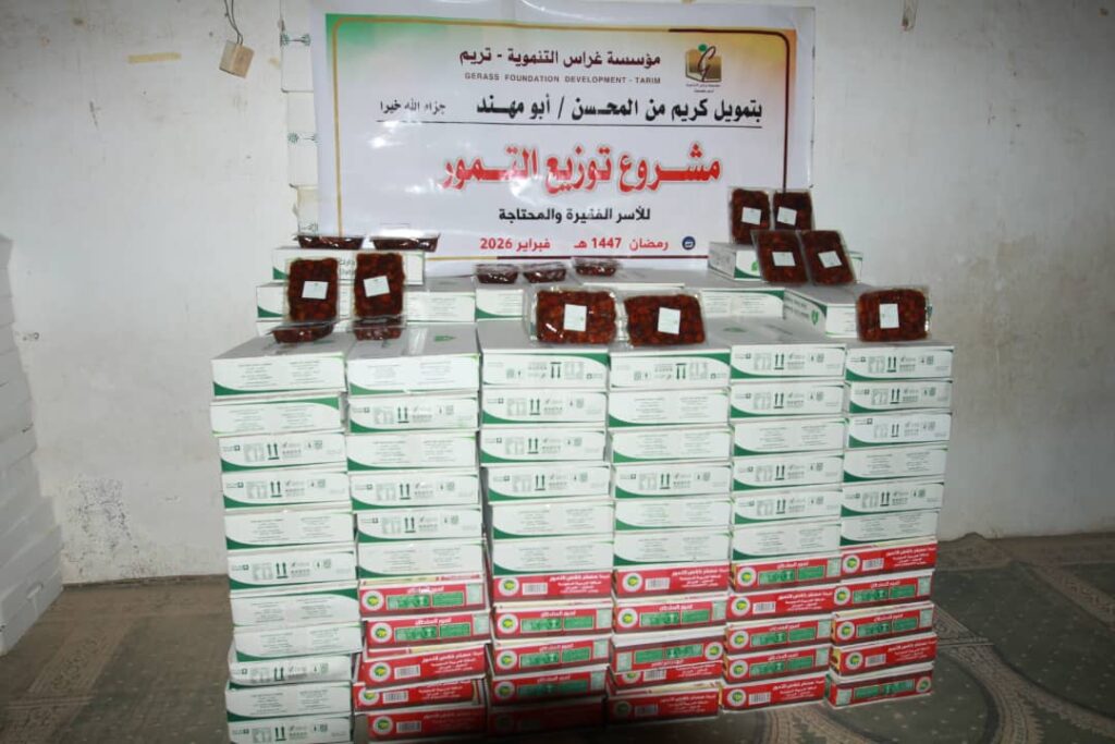 دشّنت مؤسسة غراس التنموية مشروع توزيع التمور1 رمضان 1447هـ الموافق 18 فبراير 2026م، بتمويل كريم من جمعية الحكمة اليمانية الخيرية، ومؤسسة صنائع المعروف، إلى جانب مساهمات مجموعة من أهل الخير، وذلك في إطار جهودها الإنسانية الرامية إلى دعم الأسر الأشد احتياجًا.